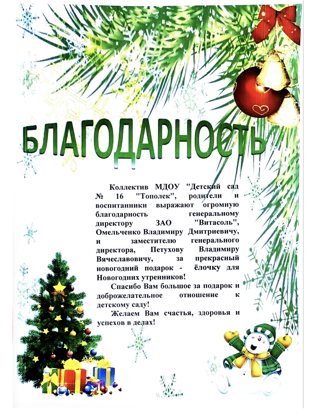 Администрация МДОУ "Детский сад № 16 "Тополек" выражает благодарность генеральному директору ЗАО "ВИТАСОЛЬ", Омельченко Владимиру Дмитриевичу, за оказанную помощь в покупке новогодней ёлочки.
